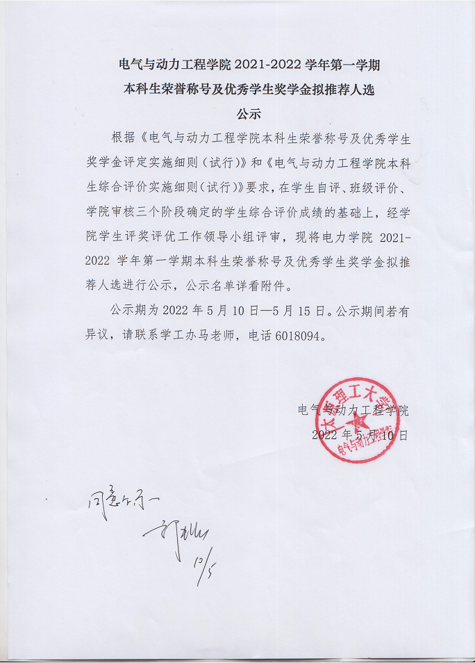 2021-2022学年第一学期本科生荣誉称号及优秀学生奖学金公示