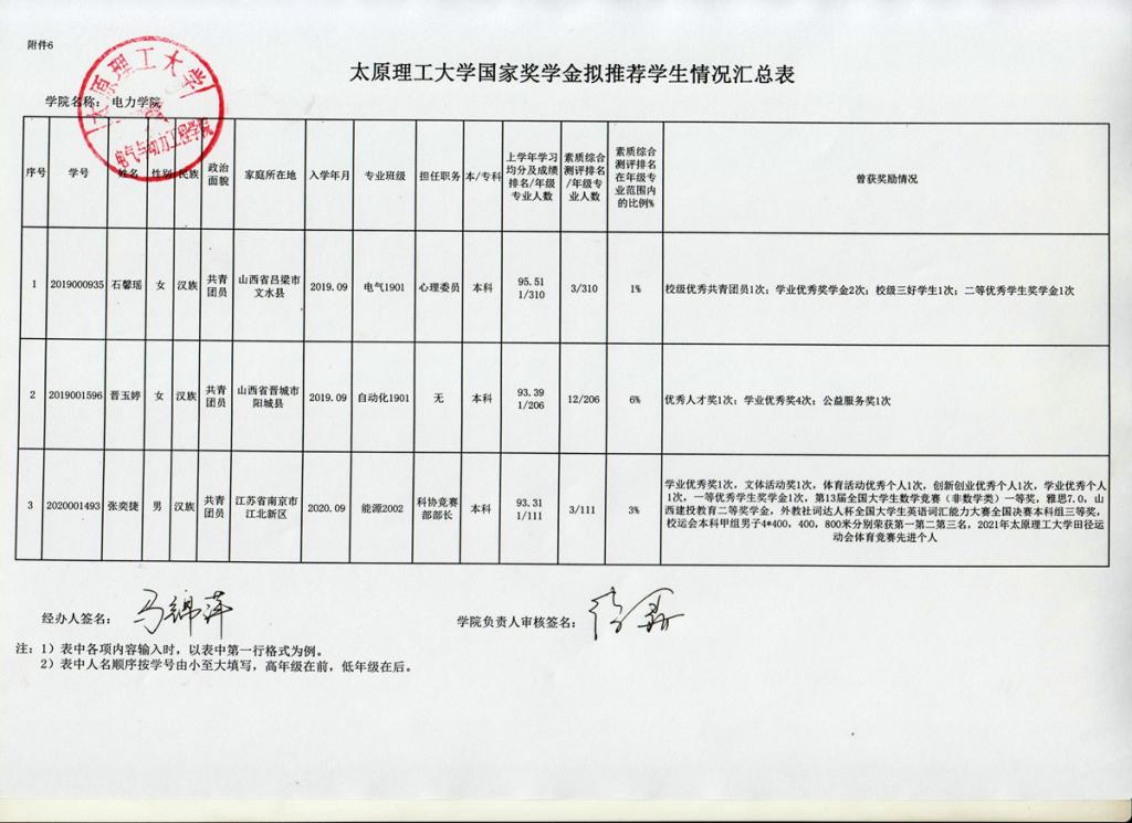 关于电力学院2021-2022学年本科生国家奖学金评选结果的公示