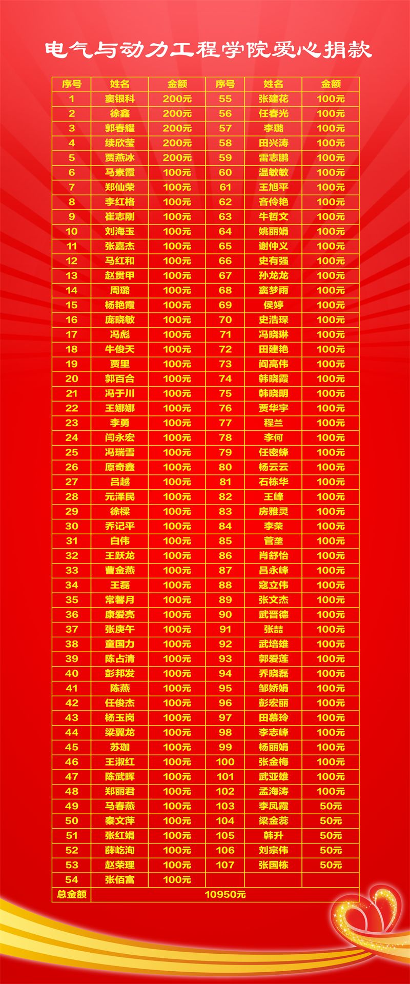 根据中共山西省委办公厅和山西省人民政府办公厅印发的《关于开展“送温暖、献爱心”社会捐助活动的通知》(〔2024〕6号)文件精神,为深入贯彻落实党的二十届三中全会精神,全面贯彻落实省委十二届八次全会精神,加强困难群众救助帮扶,继续开展“送温暖、献爱心”捐款活动。截至活动结束全院共有107人捐款,捐款总计10950元。现将我院教职工“送温暖、献爱心”活动的捐款情况公示如下: