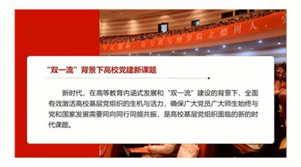 报告围绕深刻认识开展全国党建工作标杆院系培育创建的重要意义、培育创建全国党建标杆院系的理念、机制与实践以及巩固深化标杆建设成果、迈向立德树人新征程三个方面,以高校基层学院党组织书记的视角,详细阐述了为什么建、怎么建、怎样建好全国党建标杆院系,提出了“把学院党委建设成领导学院事业发展的强大‘引擎’,把党支部建设成坚强的战斗堡垒,广大党员的先锋模范作用得到充分激发和有效调动”的工作目标,对标“五个到位”与“七个有力”重点任务。“全国党建工作标杆院系”培育创建过程中,将总体建设目标化整为零,把党建工作的创新举措纳入培育创建中。在标杆院系的培育创建工作中健全完善党建工作机制,坚持问题导向、目标导向和结果导向三者相统一,让高校基层党建热起来、活起来、实起来。