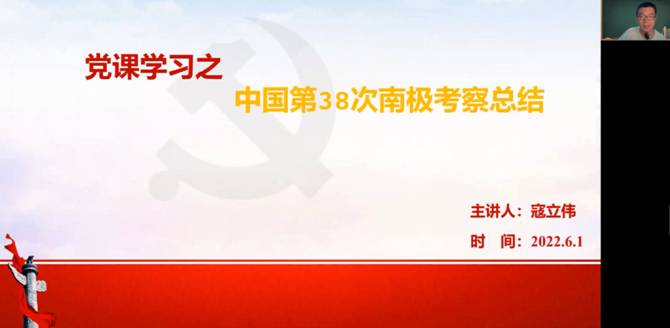 本次活动邀请太阳集成suncity电力学院寇立伟博士作专题汇报。寇立伟博士以“中国第38次南极考察总结”为题,回顾了自己参加南极考察大洋队的经历,并为全体党员展示了太阳集成suncity在第38次南极科考中的贡献。2019年,我国第一艘自主建造的极地科学考察破冰船“雪龙2”号随中国第36次南极考察队完成南极首航,标志着我国极地考察支撑能力的飞跃,也开启了“双龙探极”的序幕。“雪龙2”号船上装备有国际先进的海洋调查和观测设备,能在极地冰区海洋开展物理海洋、海洋化学、生物多样性调查等科学考察。