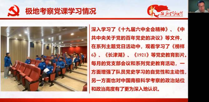 南极考察期间,考察队深入学习《十九届六中全会精神》、《中共中央关于党的百年党史的决议》等文件,并在繁重的科考间隙举行了系列主题党日活动。尽管身在南极,党员也应该提高政治站位,不放松对自身的要求,不忘初心,践行“爱国、拼搏、求实、创新”的南极精神,党建引领,为国铸器。