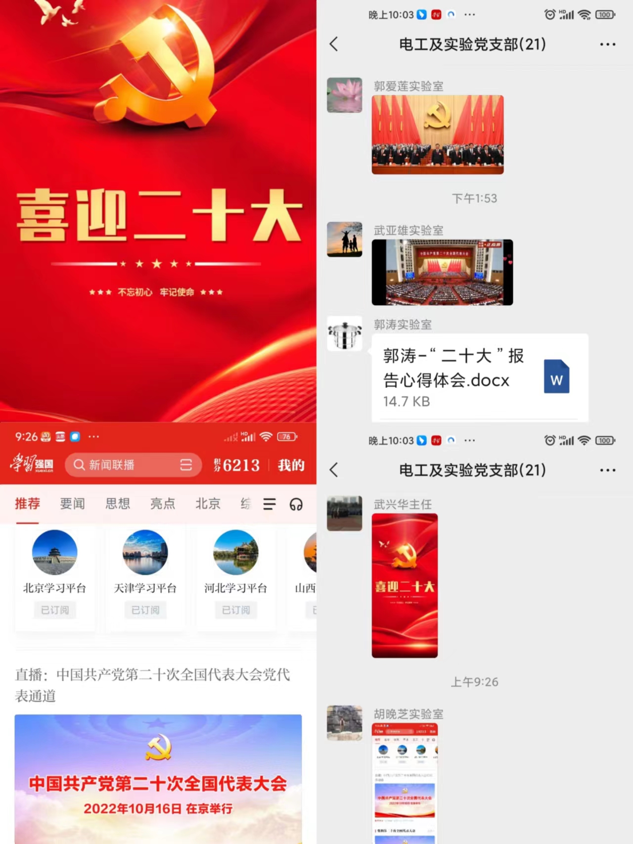 陈惠英老师表示,要把学习宣传贯彻党的二十大精神,当成首要的政治任务;武兴华老师表示,习近平总书记的报告高瞻远瞩、气势恢宏,使我们心潮澎湃、倍感振奋,一定要认真学习党的二十大精神,鼓足干劲,为学校的发展贡献力量;热能研究生党支部书记贾里老师振奋不已。他说:“横空大气排山去,砥柱人间是此峰。回望来路,每一项成就都来之不易,都是党和人民一道奋斗出来的;每一项成就的取得,根本在于有以习近平同志为核心的党中央领航掌舵,在于有习近平新时代中国特色社会主义思想的科学指引。展望未来,在全面建设社会主义现代化国家、向第二个百年奋斗目标进军的新征程上,需要应对的风险和挑战、需要解决的矛盾和问题将比以往更加错综复杂,但只要更加紧密地团结在以习近平同志为核心的党中央周围,坚持以习近平新时代中国特色社会主义思想为指导,坚定信心、迎难而上,就一定能够战胜前进道路上的任何艰难险阻,就一定能够办成我们想办的任何事情!”;张婉同志表示,作为新时代青年,我们是国家的动力,我们切实要把思想和行动统一到讲话精神上,跟党走,与党中央的脚步保持一致,奋力为全面建设社会主义现代化国家崭新篇章贡献一份自己的力量;优秀党员张靖超用16个字形容自己看完报告的感受:回顾五年,深受鼓舞,展望未来,热血澎湃。“报告多次提到教育问题,习近平总书记曾说过,‘要一件事情接着一件事情办,一年接着一年干’,我们要‘一件事接着一件事赶快办,一年接着一年鼓劲干’,以时不我待、只争朝夕的紧迫感投入到干事创业中去,不断刷新科研成果,知难而上,迎难而上,筑就中国辉煌,打开发展的新天地。”