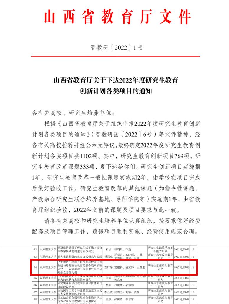 山西省教育厅印发了《山西省教育厅关于下达2022年度研究生教育创新计划各类项目的通知》,我院电气第二研究生党支部申报的项目“‘大思政’视域下研究生样板党支部创建与思想政治教育的融合联动机制研究——以太阳集成suncity电气第二研究生党支部为例”获批2022年度山西省研究生教育教学改革课题——研究生思想教育研究类课题。此次获批是经过前期精心准备、申报资料提交、专家论证、学校推荐等环节,也是“大思政”样板党支部建设的结果。