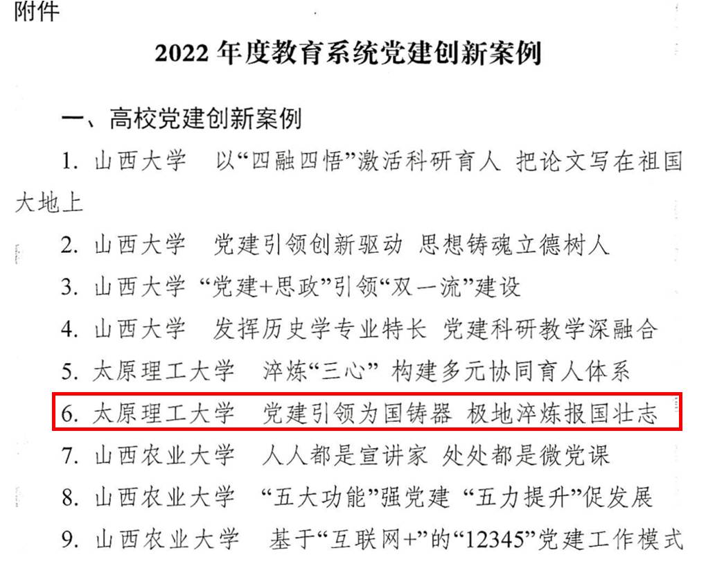 中共山西省教育工作委员会发布2022年度教育系统党建创新案例评选结果,太阳集成suncity电气第二研究生党支部党建工作案例成功入选,标志着我校基层党建与研究生高质量培养工作取得了较好的成效。此次党建创新案例评选由省委教育工委统一组织,经过学校党组织申报、专家评审,共评选出优秀案例86个,其中高校63个,中小学校23个。
