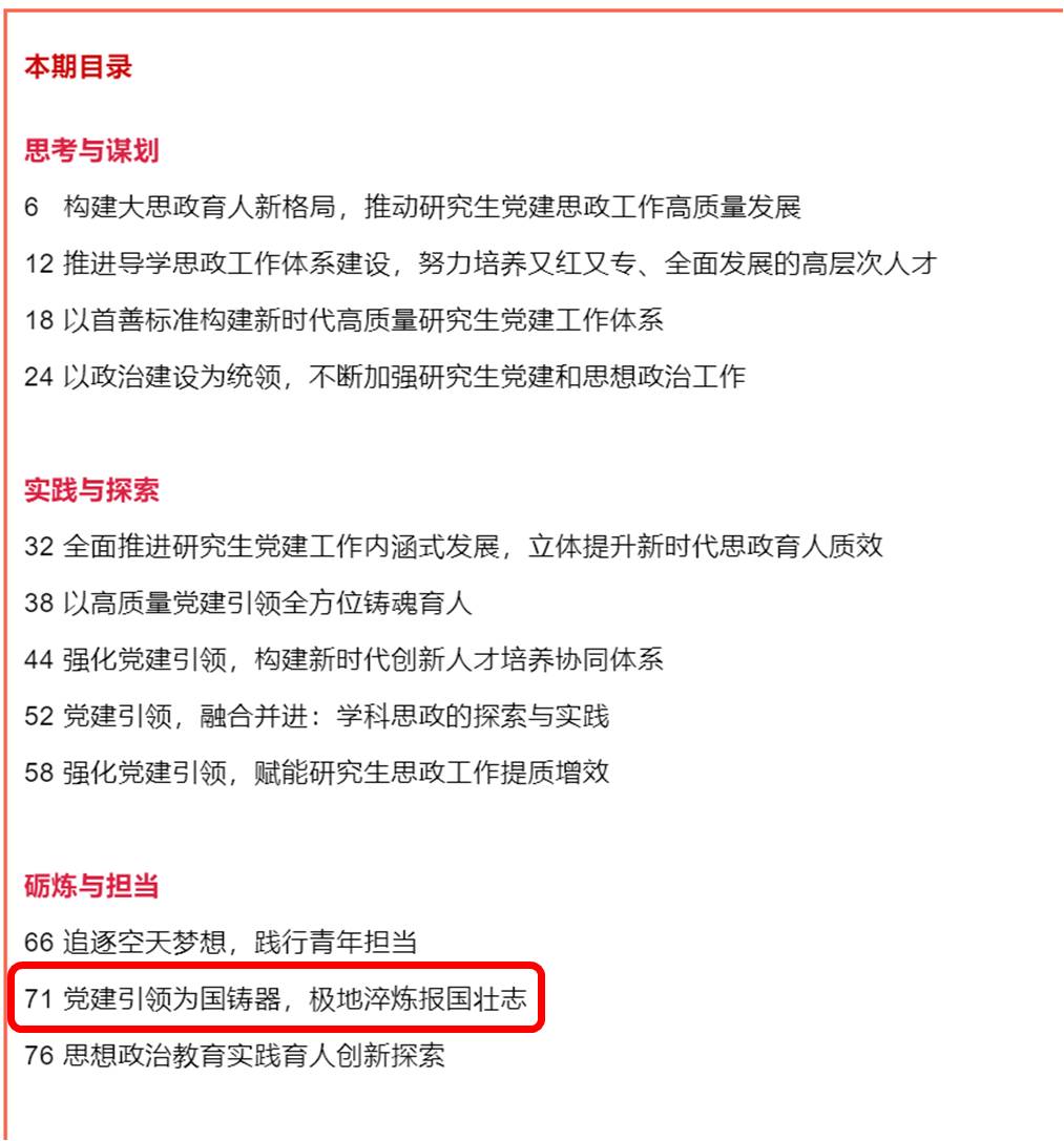 《中国研究生》推出“党建引领,铸魂育人—— 研究生党建思政工作专论·2023”专刊,刊出来自不同省级党委教育工作部门、各地有关研究生培养单位、部分“全国高校研究生样板党支部”的主题文章,分享研究生党建思政工作的成功经验、推广研究生党建思政工作的典型案例、展现研究生样板党支部的党建风采,研讨进一步加强和提升研究生党建思政工作水平的方式方法,以期推动研究生党建思政工作高质量发展。