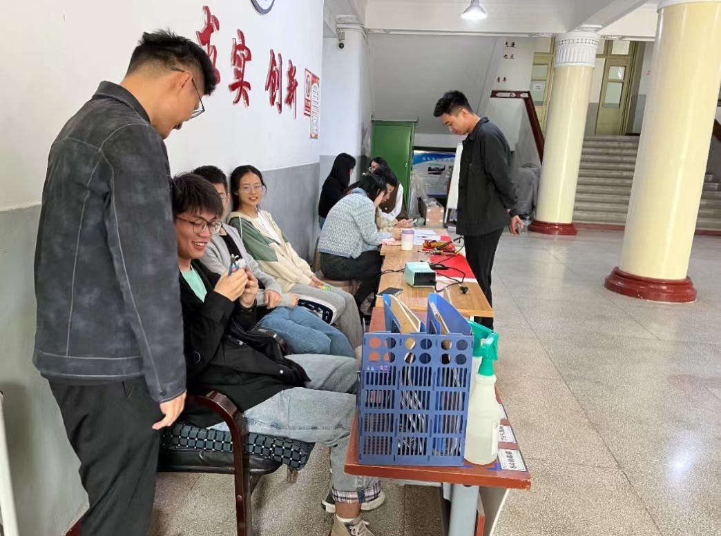 支部党员们来到电机馆一层大厅,给同学们提供设备修理服务,大厅里往来着党员们忙碌的身影,大家都分工明确、井然有序,用行动诠释了奉献精神,发挥了党员先锋模范作用。