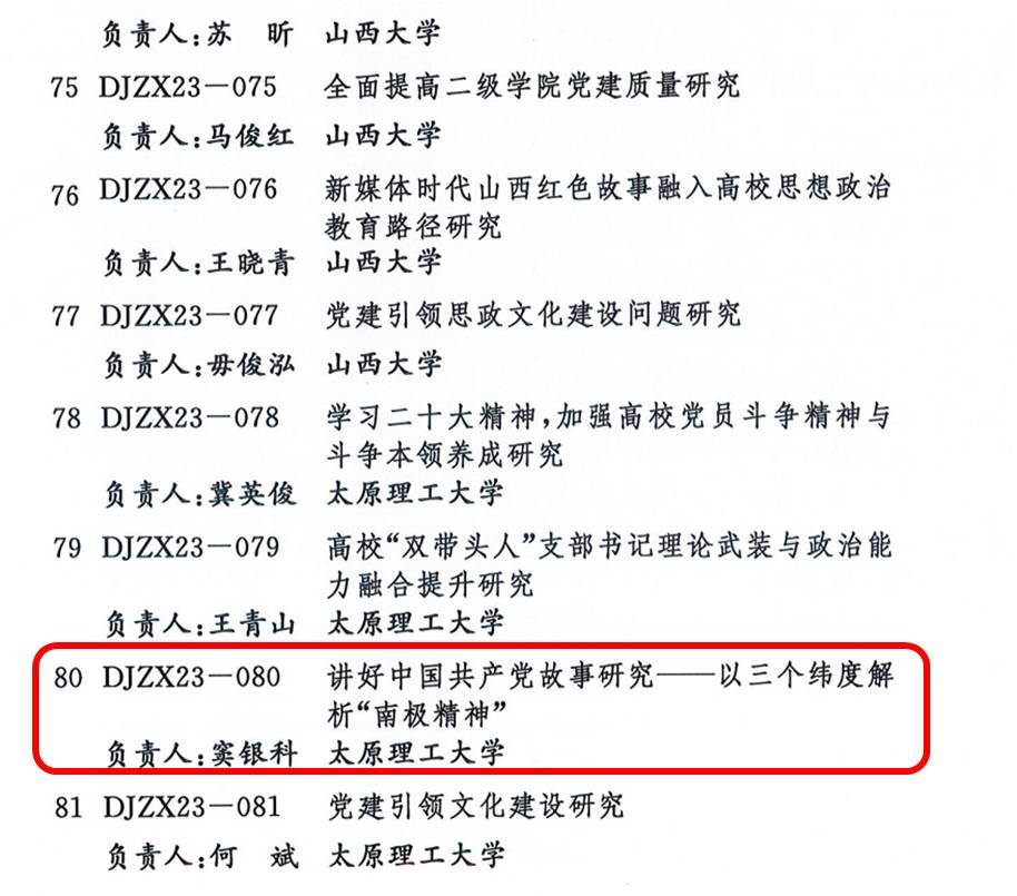 近日,经山西省党建研究会秘书处认真组织,严格评审,评出41 项重点课题、62 项专项课题、197 项自选课题列为“2023 年度山西省党建研究专项课题”。太阳成tyc7111cc集团电气第二研究生党支部申报课题《讲好中国共产党故事研究——以三个纬度解析“南极精神”》获批自选课题。