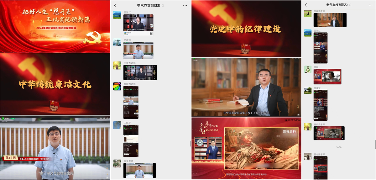 为推进党纪学习教育,加强反腐倡廉建设,621日、28日,电气系党支部组织党员同志在线观看了2024年高校党组织示范微党课《中华传统廉洁文化》、《党史中的纪律建设》展播。