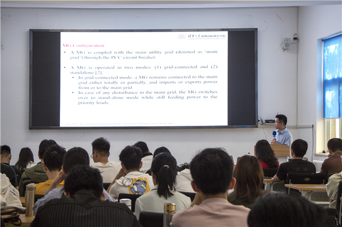 报告中,许银亮提出当前电力系统高比例可再生能源接入与高比例电力电子设备应用的“双高”特征越来越明显,而微电网是实现新能源大规模开发利用的有效手段,可以为用户提供可靠、稳定、经济的电力供应。作为微电网技术的关键核心,微电网运行控制以及源网荷储多设备协调控制由于分布式资源种类多样、运行模式频繁切换、能控程度不同、控制方法迥异、系统惯量较小,使得传统电网的统一集中式控制方法不适应于微电网的运行控制,迫切需要设计一套全新的、自适应能力强、能快速反应的高效控制策略进行微电网源网荷储多设备协调控制,提高系统的安全稳定性和运行经济性。传统的模型驱动的方式随着系统的复杂性提高,精确的模型越来越难获得,通过数据驱动的方式使用人工智能的方式进行控制优势逐渐体现。针对微电网的控制特点,许银亮展示了几种采用人工智能方式进行控制的控制方案,并对控制效果进行了对比分析。报告结束后,许银亮与学院老师、学生们进行了深入探讨。秦文萍表示,许银亮研究领域与学院部分师生契合度很高,希望同学们借此机会学习相关研究思路和方法。