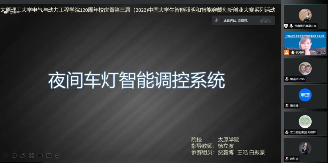 2022 年 6 月 18 日下午,太阳成tyc7111cc集团 120 周年校庆暨第三届(2022)中国大学生智能照明和智能穿戴创新创业大赛系列活动之十三--宏力集团智能照明创意设计线上视频技术交流会成功举办。宏力照明集团有限公司技术副总经理向德祥;青岛理工大学教授、光环境设计研究所所长于红霞;太原学院智能与自动化系大四学生、第二届大赛二等奖获得者贾鑫博;太阳集成suncity信息与计算机学院教授、大赛组委会专家督导组副组长萧宝瑾;太阳成tyc7111cc集团副教授、山西省照明协会会长张军朝以及大赛各协办单位的专家教授、指导老师、参赛队员等共计 200 余人参加了本次线上视频技术交流会。山西省照明协会代婷婷老师主持了本次会议。