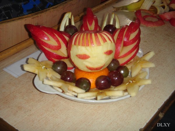 活动中,各组参赛选手创意迭出,充分发挥独特的想象力和团队协作能力,现场制作并展示了精美、形态各异的水果雕琢作品。栩栩如生的动物形体,凸显童趣,别具特色;以香蕉为船、葡萄枝为帆的造型,寓意我们伟大的祖国乘风破浪、扬帆远航。
