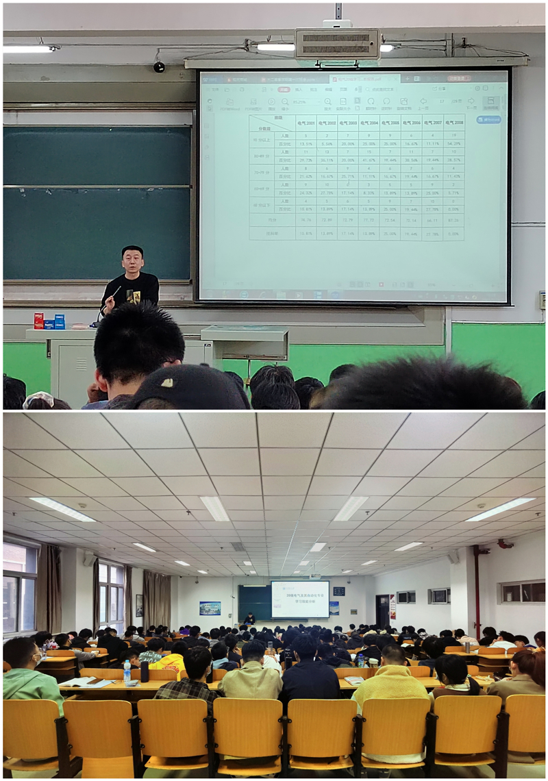 针对上学期的学业成绩,会前形成学习效能分析报告。就各科成绩进行横向、纵向比较,各门课程的各分数段、平均分、挂科率等以班级和年级为单位进行分析比较。会上,史有强以主题班会的形式向班级同学详细解读了上学习期的各科成绩,各班四六级通过情况。成绩优异的同学分享了自己的学习方法。