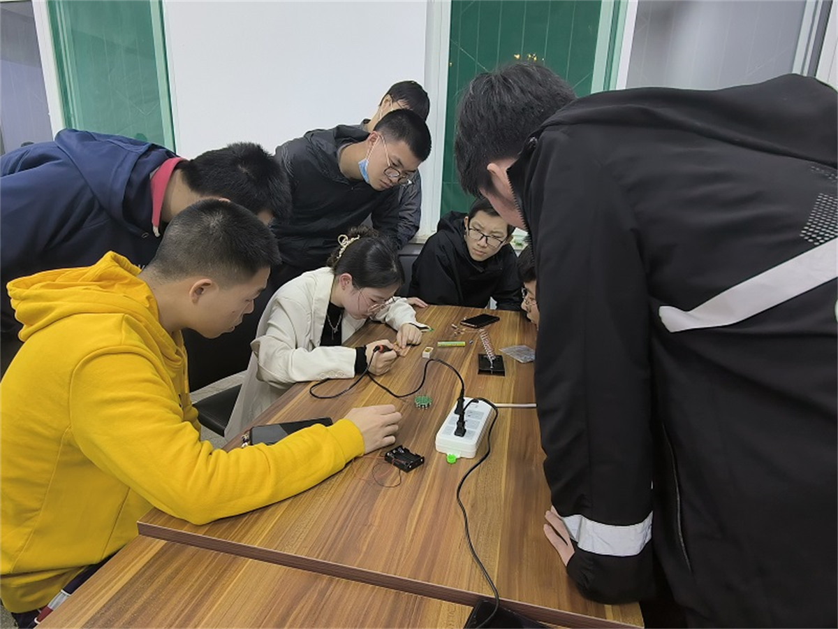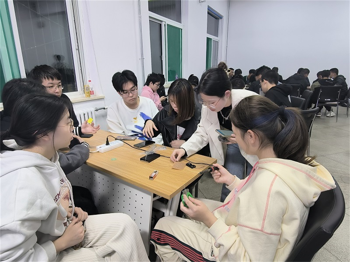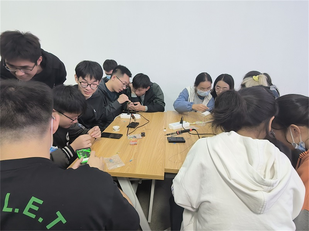 在动手实践环节中,同学们分组配合。先由任婧同学展示操作,各组人员观摩之后再亲自上手,由工作人员在旁指导,纠正同学们操作方法,答疑解惑并对焊接失败的案例进行恢复修整。最后,同学们都圆满完成了焊接任务,并陆续展示了自己的焊接成果。
