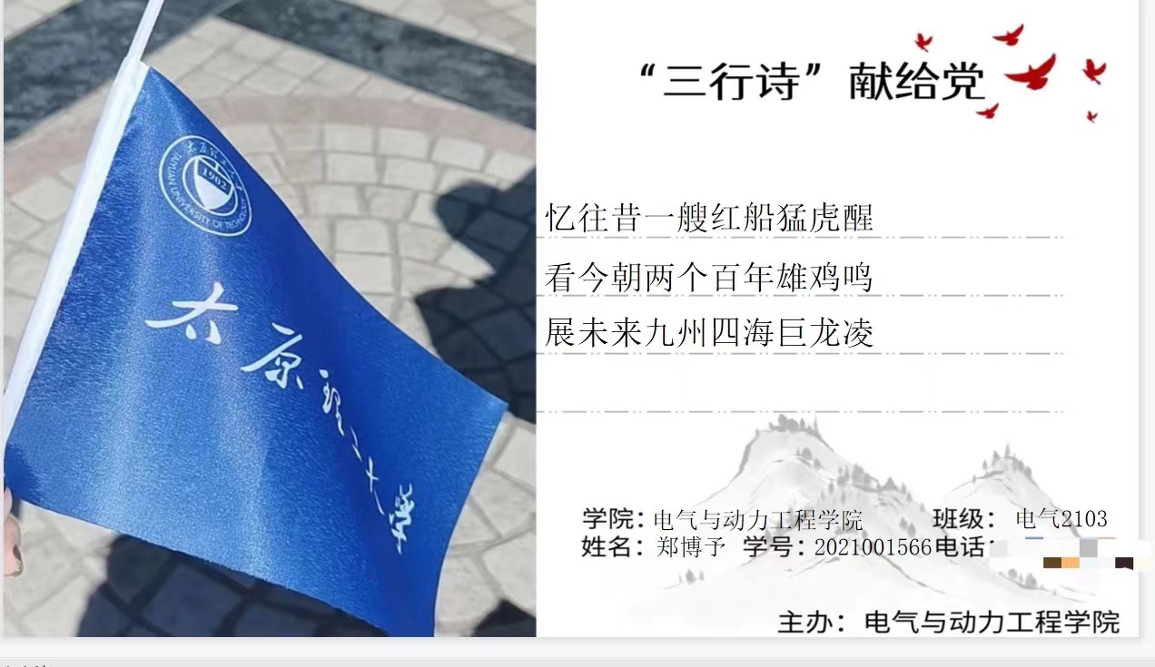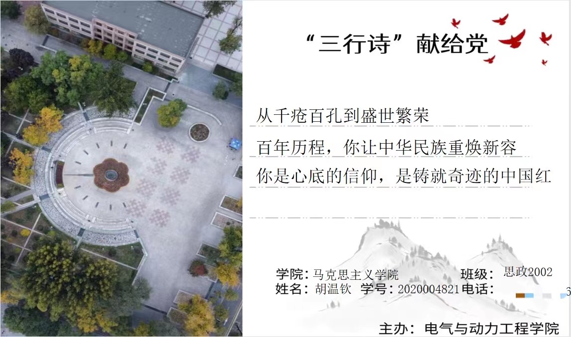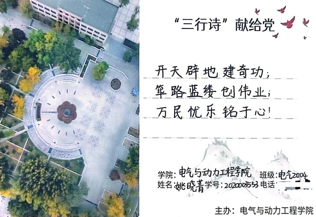 为了庆祝中国共产党第二十次全国代表大会胜利召开,激发同学们“永远跟党走、奋进新征程”的奋斗热情,引领同学们对党和祖国深情告白,自信自强、守正创新,踔厉奋发、勇毅前行。太阳成tyc7111cc集团于十月下旬开展了“献礼党的二十大,永远跟党走,奋进新征程”三行诗献给党征集活动,邀全校学子共抒爱党爱国之情。