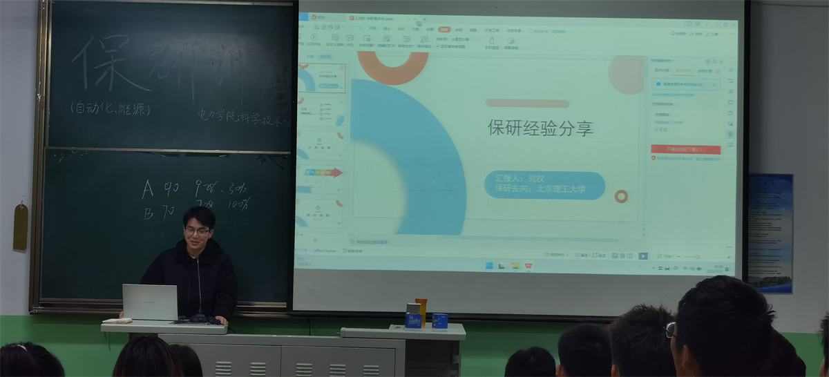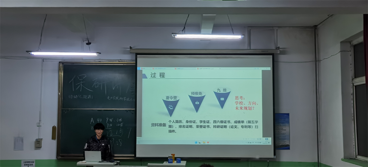 电气专业的分享会在电机馆3133举办,周佳龙、柴艺晗等4位同学各抒己见,详细地介绍了近几年学院保研情况以及在保研准备、保研流程等方面的注意事项。同时,几位同学分享了平时的学习经验与方法,讲述了大学学习的心路历程,令同学们印象深刻。