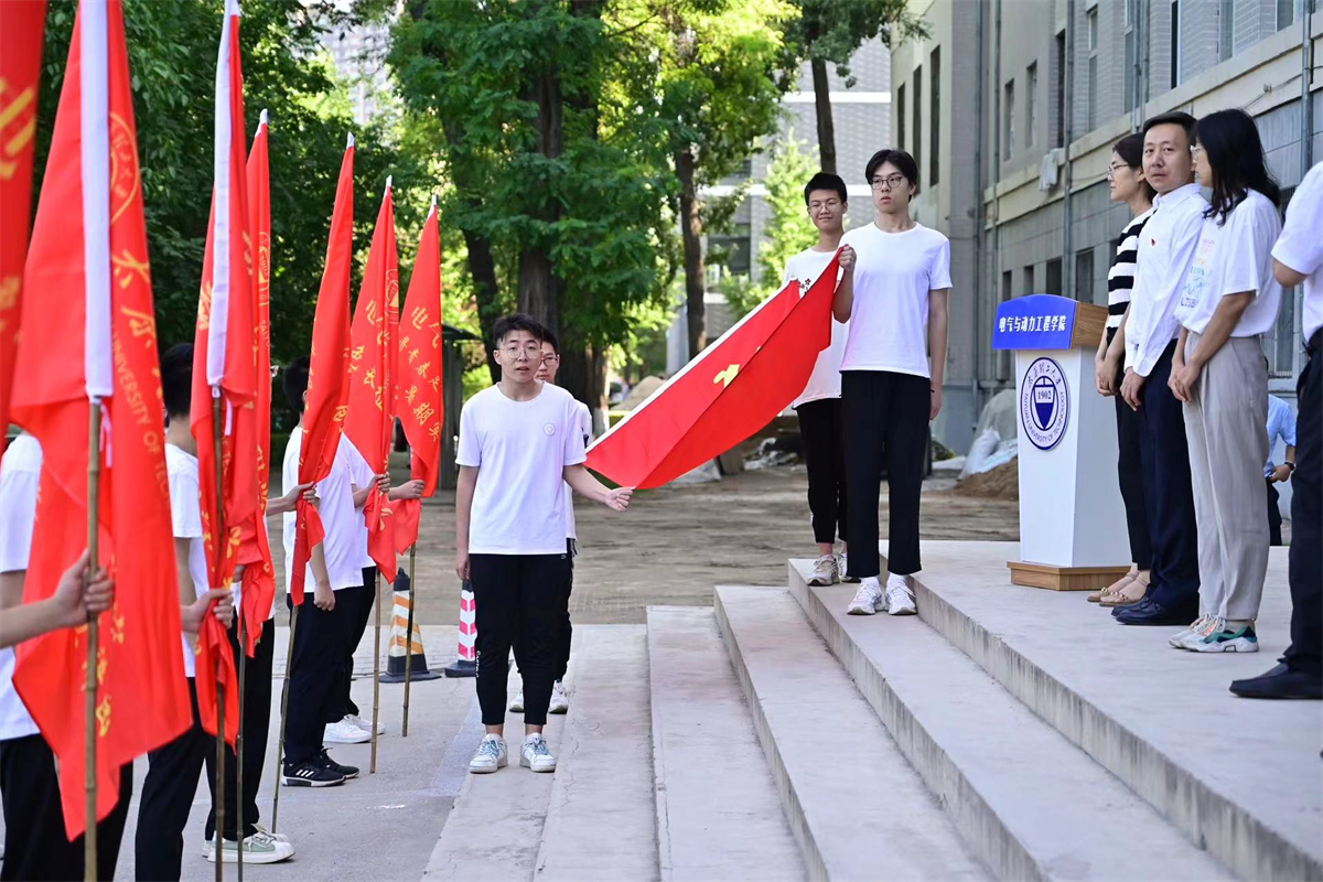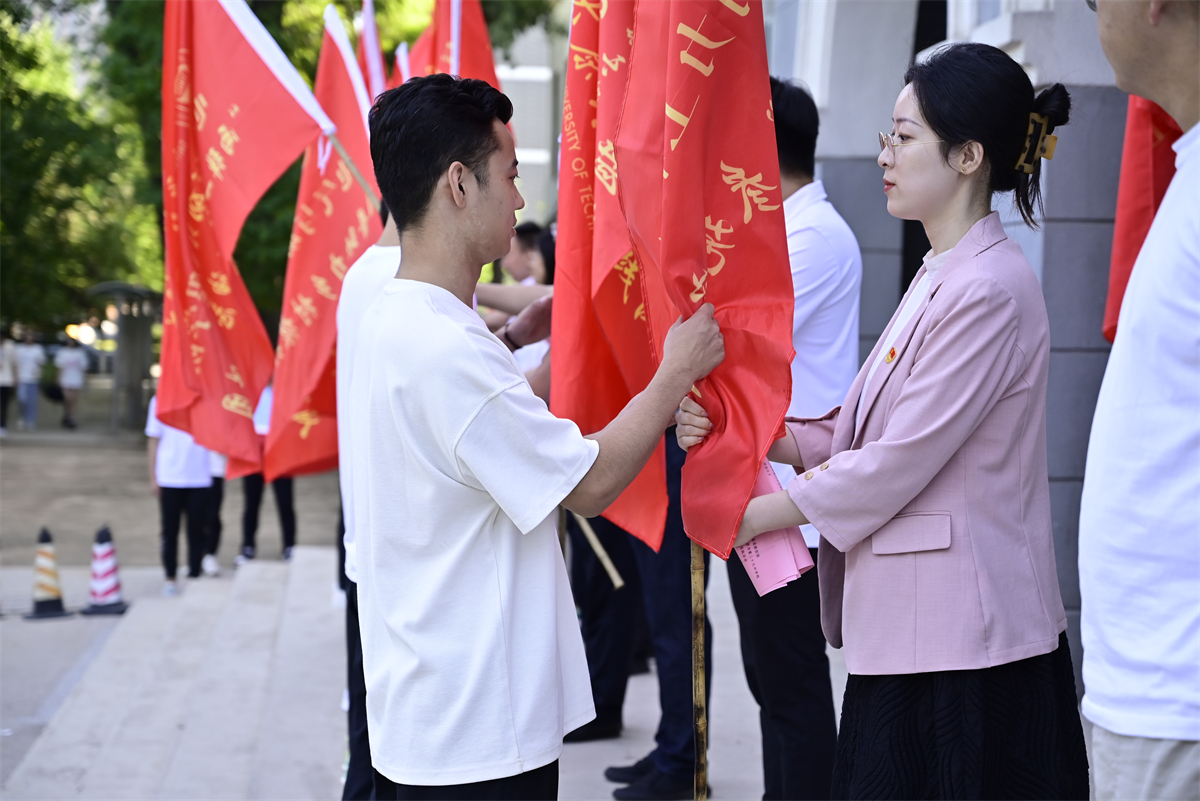 徐鑫和田韶华分别为我院和太原市第二十九中学校实践队伍授总旗,郭春耀及各辅导员代表为重点队伍和专项队伍授队旗。