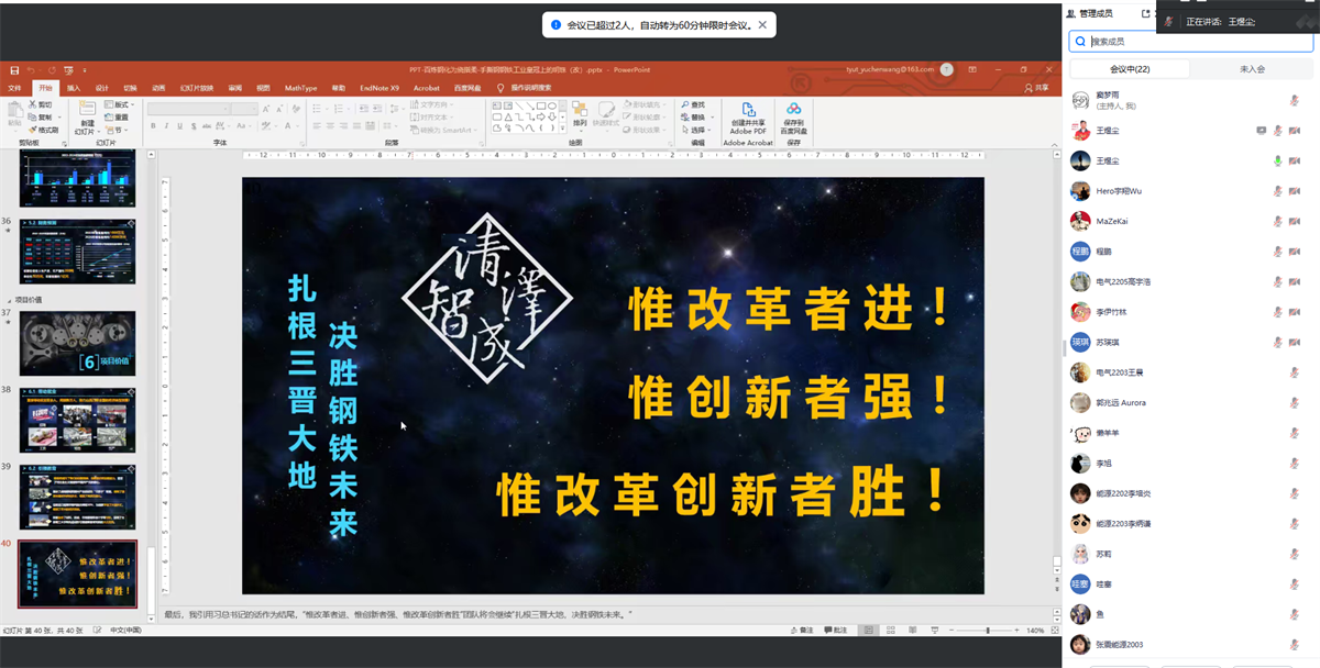 会议伊始,马泽楷首先为大家细致地梳理了比赛的整个流程,并强调了各个环节中需要注意的关键事项。随后,王煜尘针对高教主赛道、红旅赛道的不同侧重点进行了深入的讲解,包括PPT制作思路,路演技巧,比赛评分规则等方面。最后,在答疑环节,同学们积极发问,两位前辈也一一详细解答了同学们关于赛程安排、财务报表展示等方面的问题,干货满满,同学们表示受益匪浅。