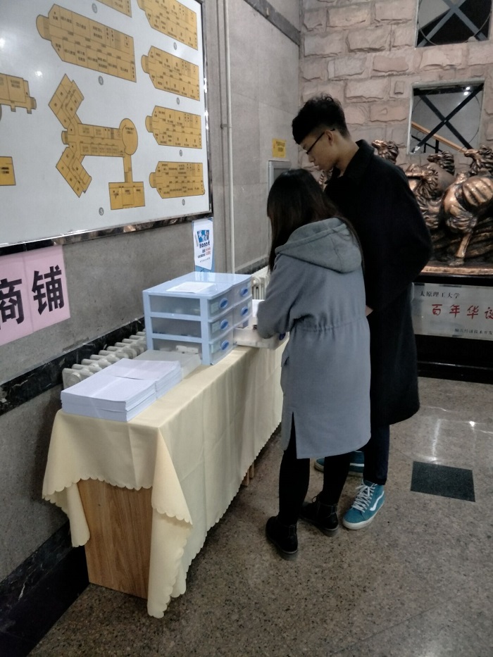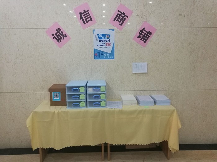 2015年10月,“诚信商铺”第一次出现在了明向校区,出售签字笔、笔芯、纸巾等学习生活用品。目前,“诚信商铺”在明向校区已经扩大到了五个点,覆盖明向校区全部教学楼,增设了留言本,增加了商品种类,并支持支付宝、微信等多种付款方式。两年来,“诚信商铺”完全实行无人值守,自助购物,凭诚信支撑付款的经营模式,目的是在服务全体师生的同时,倡导诚信,发扬中华民族传统美德,弘扬诚实守信的优良传统。截至目前,“诚信商铺”的诚信率高达97%,受到了社会媒体的广泛关注,《山西青年报》等媒体做了专门报道。近期,在“诚信商铺”于明向校区成功经营两年多的经验基础上,学院对其进行了新一轮的改造,并在迎西校区也同时开办。