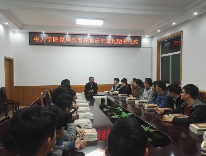 10月30日晚,电力学院家风教育探索研究基地在学院二层会议室举行赠书仪式,向学院本科15、16级各班赠送了家风教育图书。学院党委书记赵惠民出席赠书仪式并讲话,院学工办主任、家风教育探索研究基地负责人杨振东主持仪式,学院全体辅导员,本科15、16级各班班长参加了仪式。