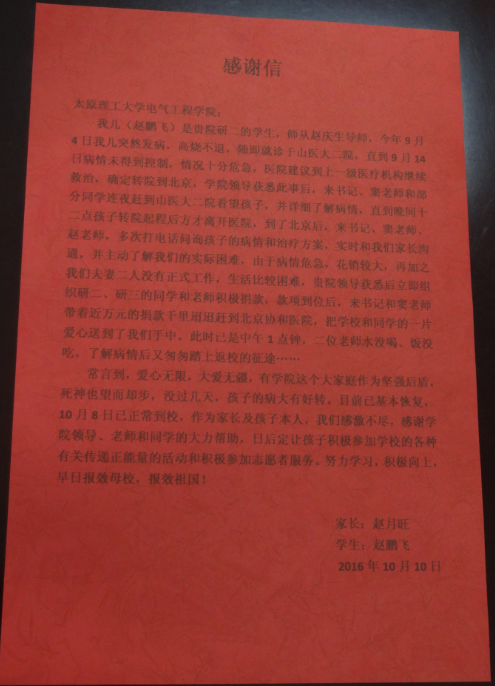 月中旬,赵鹏飞同学突发急病,进入山大二院治疗,后又转往北京协和医院,在生病住院期间,学院来志斌副书记,研究生联系人窦银科教授以及