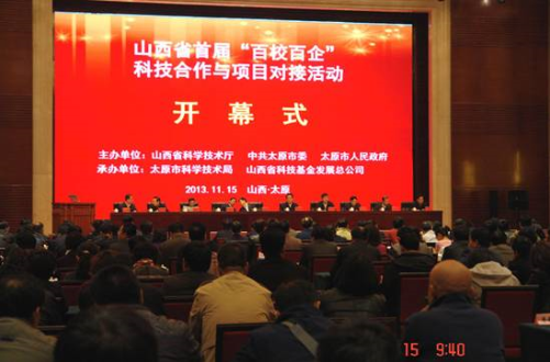 11月15日,山西省首届“百校百企”科技合作与项目对接活动在并州饭店隆重举行。本届活动围绕着“加强产学研用合作、推进创新驱动发展”主题,旨在进一步促进我市传统产业转型升级和战略新兴产业发展,促进我市企业与重点高校产学研用深度融合,提升企业自主创新能力。出席此次对接活动的领导有太原市委副书记、市长耿彦波,山西省科技厅厅长贺天才,太原市委常委,秘书长陈河才,太原市副市长寿伟光,市政府秘书长刘鵷以及省、市政府有关部门的领导,高校、企业代表近400余人。