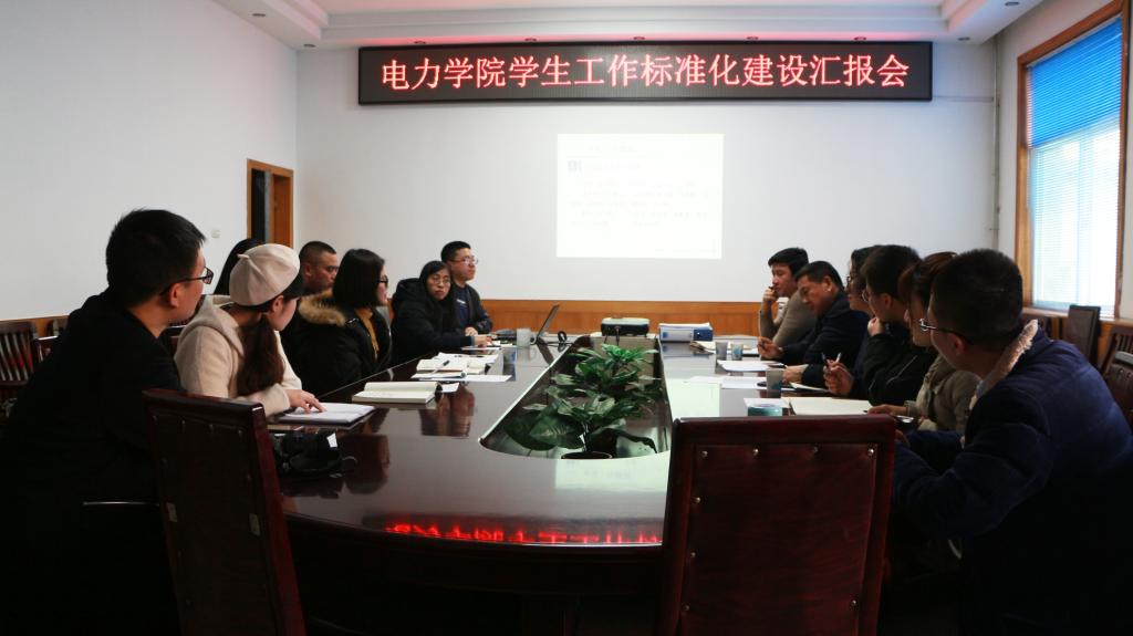11月19日下午,校党委副书记刘润祥、学生处副处长李鹏一行三人莅临电力学院指导太阳集团标准化建设工作。学院党委书记赵惠民、副书记张蒙、学工办主任及全体辅导员参会。