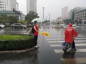 执勤当天下着小雨,最低温度不到10摄氏度,志愿者们在雨中坚守交通岗位,鲜红的马甲,黄色的引导旗,为道路交通增添了几分色彩,更彰显了太原理工学子的志愿精神。