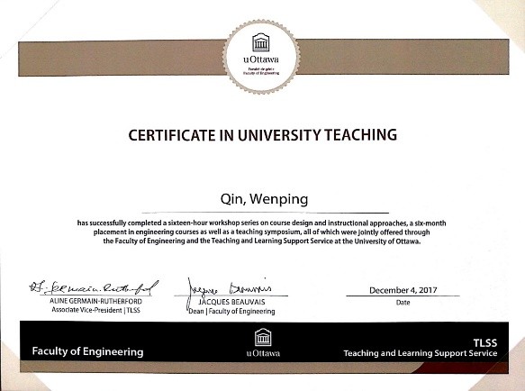 秦文萍老师于2017年5月获得国家留学基金委2017高等教育教学法研修班第5、6期(工程类)留学资格。2017年6月赴华东师范大学参加了为期两周的行前培训。2017年7月3日-2017年12月25日,赴加拿大渥太华大学进行交流访问。访学期间,参加了 “A North American Approach to Teaching in Higher Education”课程、电气专业相关课程的学习,并与渥太华大学工程学院电气与计算机系师生就教学、科研活动展开了充分交流,对渥大教学组织、管理、科研、国际留学生培养等工作有了充分了解,为回国后深入开展以专业工程认证工作为核心的优势特色专业学科建设、开设全英文课程做好了充分准备,为转变本科教育观念、提升本科教育质量奠定了坚实的基础。