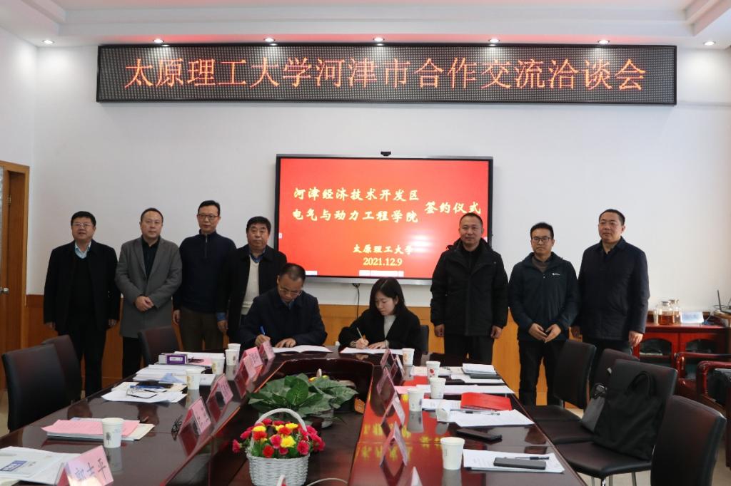 会议由校国内合作处副处长石洪涛主持,校国内合作处杜鲲处长和河津经济技术开发区管委会毋勇敢副主任分别致辞,与会人员就双方合作项目、合作机制进行了深入讨论。郭春耀副书记介绍了电力学院在招生、就业等方面基本的基本情况,希望今后能在大学生实习实训、就业创业等方面加强合作,窦银科副院长详细介绍了学院近几年取得的科研成果、科研队伍建设、科研平台建设、企业科技指导员派遣、技术转移中心建设等工作情况。最后,窦银科副院长和河津经济技术开发区管委会人力资源部部长许晶代表双方签署了科技合作协议,热能工程系主任刘海玉和中铝山西铝业有限公司负责人签署了校外实习基地协议。
