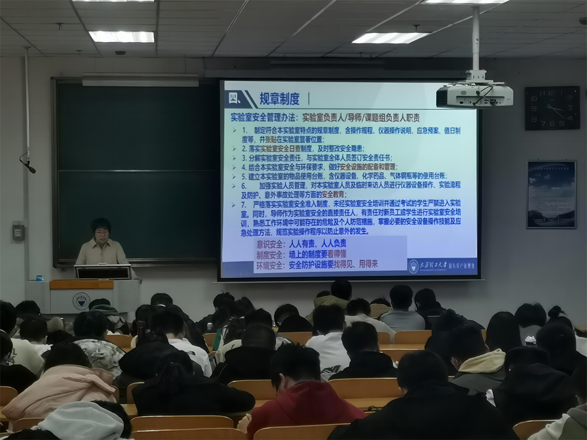 刘颜玲老师以近年来高校发生的实验室安全事故为切入,结合我校实验室基本情况,从实验室安全基础知识、实验安全管理办法、实验操作规程、实验室突发事故防范与应急处置、各种危险源的识别等方面展开讲解,对实验室安全进行警示教育,使同学们深入学习了实验室的基础知识及科研实验的规章制度、安全操作规程,更深刻认识到实验室安全的重要性。